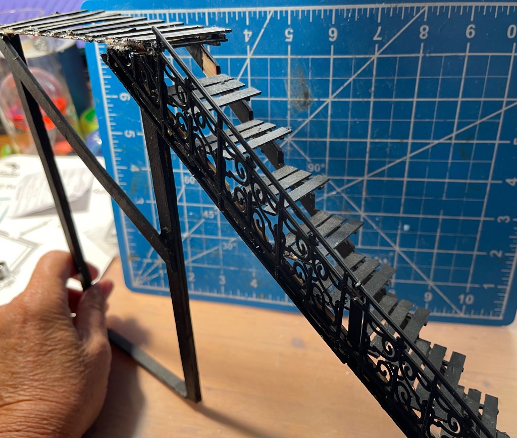 Sure, the steps don’t align with the original, but that’s okay, the printed ones are spaced more to scale. And the newel posts at the top and bottom are a complete mess. They were too fine to print. And I didn’t even do the railing. And then there’s the stringing.