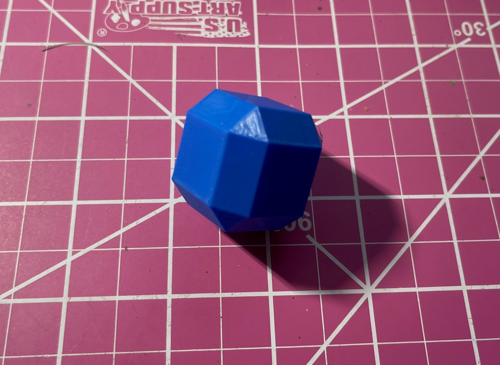 Soon my printer was working on Benchy. About ninety minutes later I had a little blue boat covered in plastic cobwebs. I reviewed a video on what Benchy tells you about your printer and how to fix some of the problems it reveals. My platform was a little too low, and those cobwebs are called “stringing,” left when the nozzle moves across open air between parts of the print.