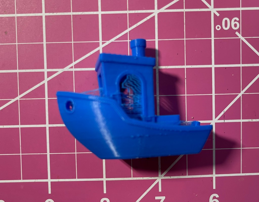 One step at a time, I said. I re-leveled the bed and reprinted Benchy. That helped the first issue. Then I researched “stringing” and spent a while in the slicer looking for the right setting to change. Found it. Changed it. Re-sliced. Sneaker netted the card to the printer and printed again. Oh well. Clearly I’ll need to mess with that setting some more.