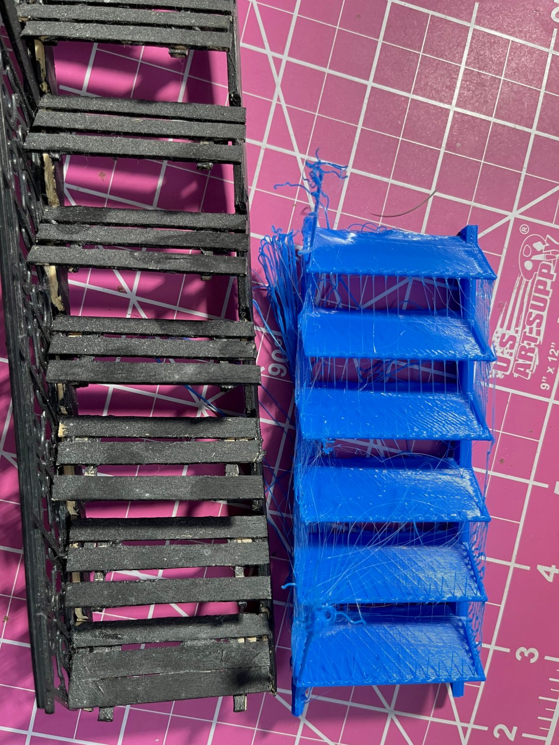 Sure, the steps don’t align with the original, but that’s okay, the printed ones are spaced more to scale. And the newel posts at the top and bottom are a complete mess. They were too fine to print. And I didn’t even do the railing. And then there’s the stringing.