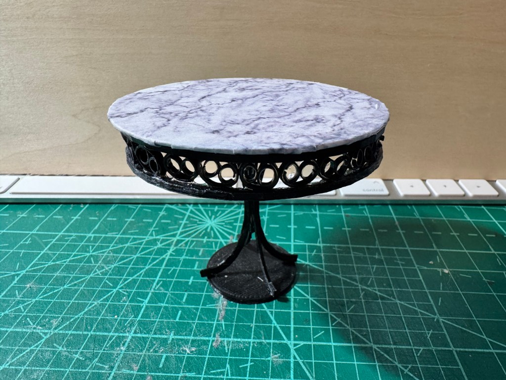 Finally, I found a photo of white marble online, scaled it down, and printed it for the top. I might print a slightly larger base, but otherwise, I’m done fiddling with all these tiny circles.