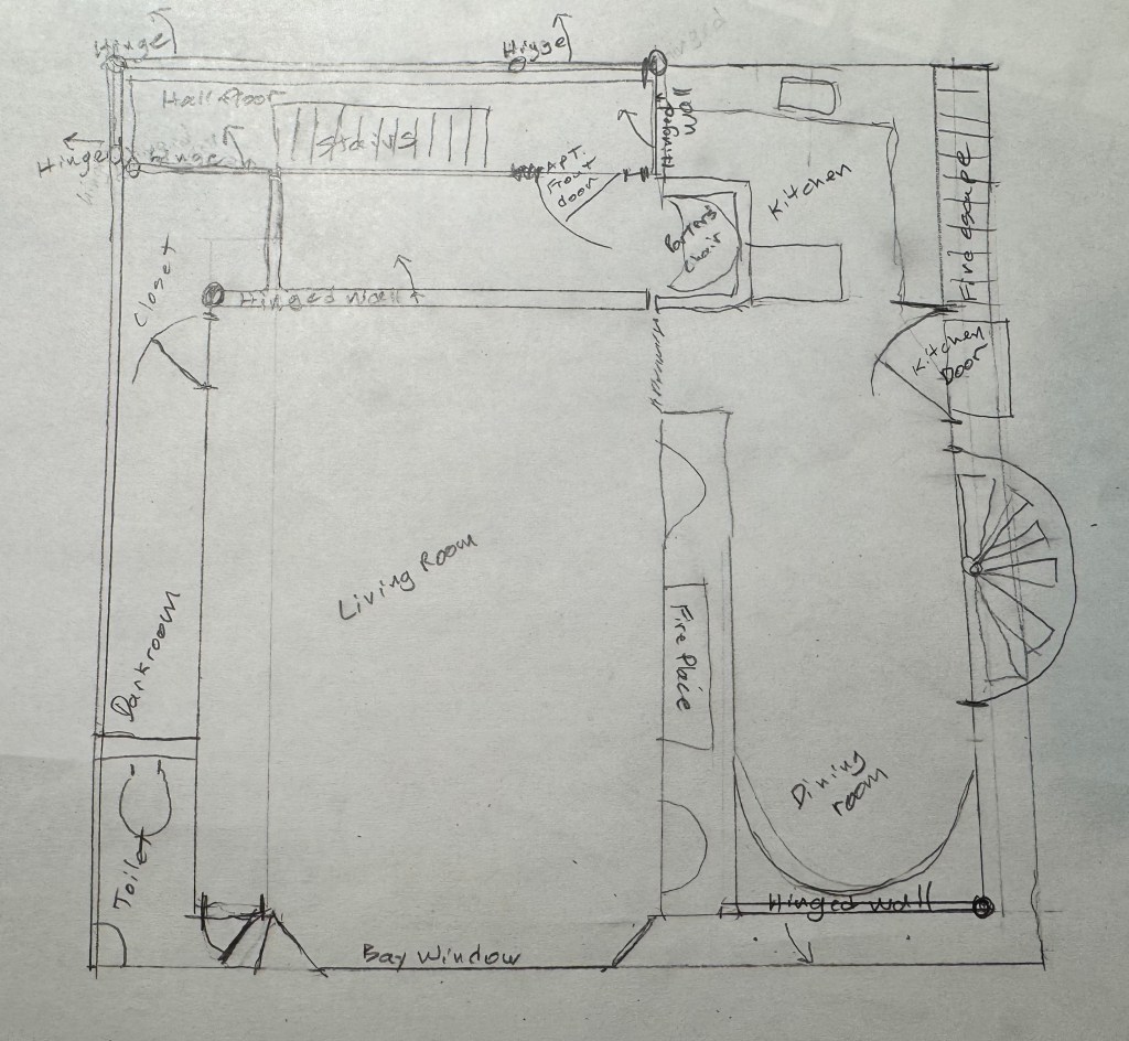 This diagram also shows the other hinged panels that have been part of the house for years: In the lower right, the hinged wall at the back of the dining room, and at the top, toward the right, the hinged wall that forms the short side of the kitchen.