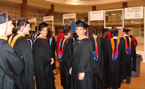 The graduates lined up by degree and school for the morning commencement ceremony. We learned that there were twice as many distance grads as on-campus students.